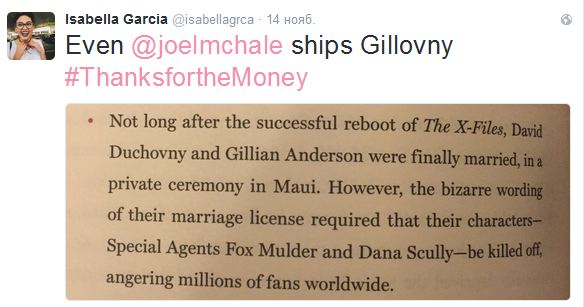 Джоэл МакХэйл, сыгравший Тэда О'Мэйли в 10 сезоне "Секретных материалов", издал свою книгу под названием "Thanks for The Money", в которой "поженил" Дэвида Духовны и Джиллиан Андерсон. Он, конечно, пошутил, ха-ха.