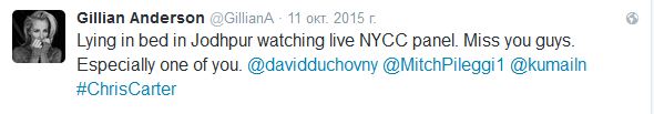 Пока мужская часть съемочной группы "Секретных материалов" отдувалась на Comic Con'е в Нью-Йорке, Джиллиан Андерсон укатила на съемки в Индию, откуда и написала этот твит:
